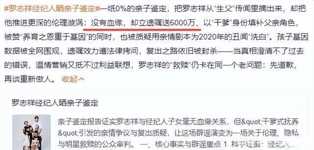 罗志祥的经纪人小霜早晨发了一封亲子鉴定,网友们坐不住了。 大家都在说“小猪终于承认孩子是他亲生的了吧”。 结果点开亲子鉴定那一页,结论写得明明白白:亲子概率0%,完全排除。 这反转也太狠了吧,没有血缘,却把孩子宠了快10年,这到底是啥神仙情谊。