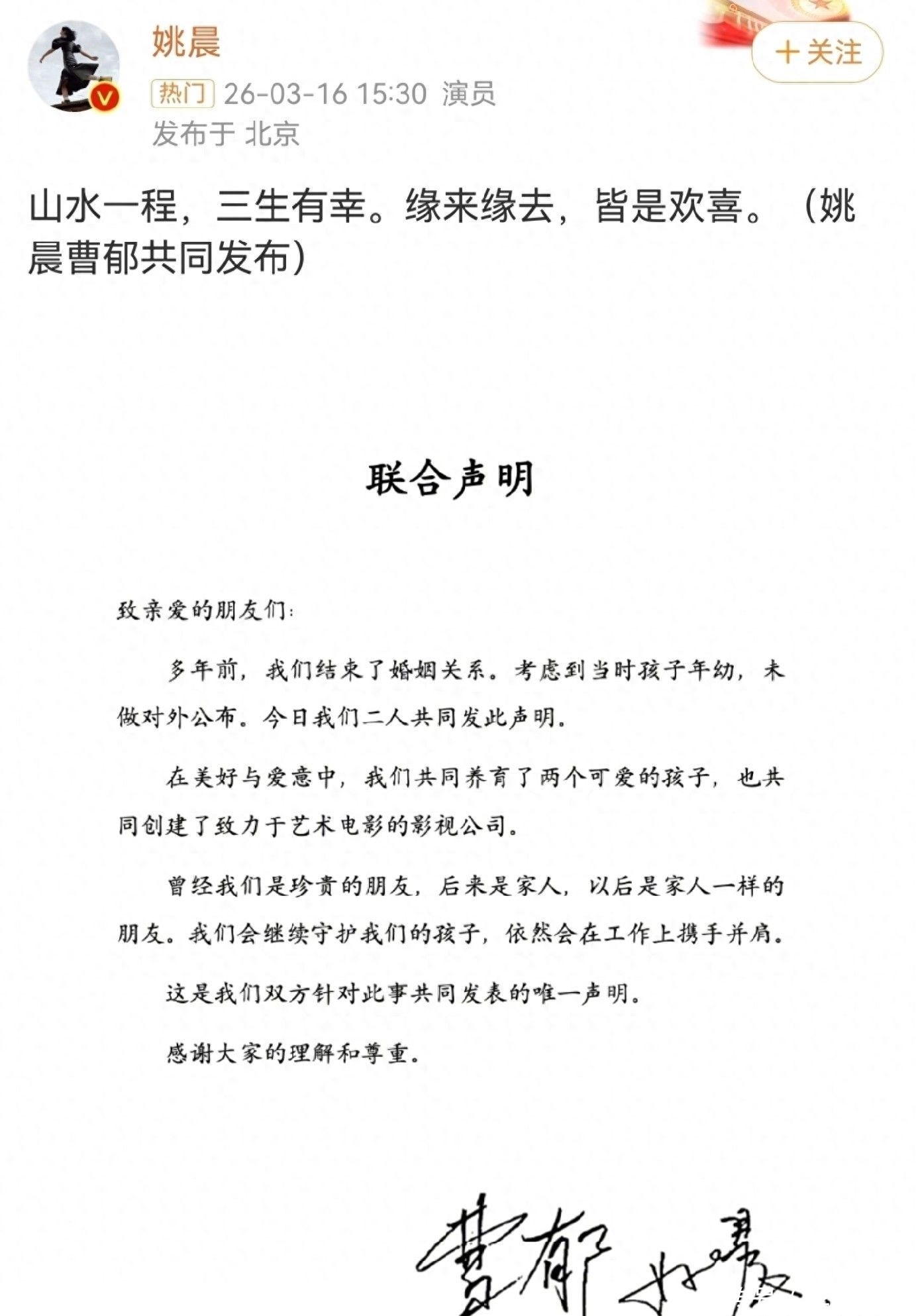 谁也没预料到,3月16日清晨,姚晨与曹郁同步发布一份联合声明,语气平和却字字千钧: