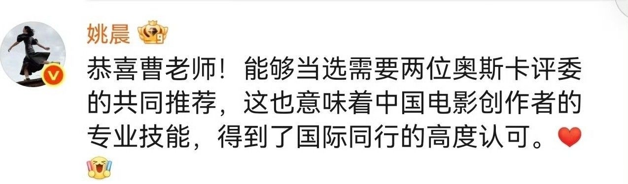 2025年6月,曹郁获任奥斯卡评委,姚晨转发祝贺时措辞严谨:“恭喜曹老师入选奥斯卡评审团。”全程未使用任何亲属称谓,疏离感扑面而来,如同两位行业同仁间的常规礼节。