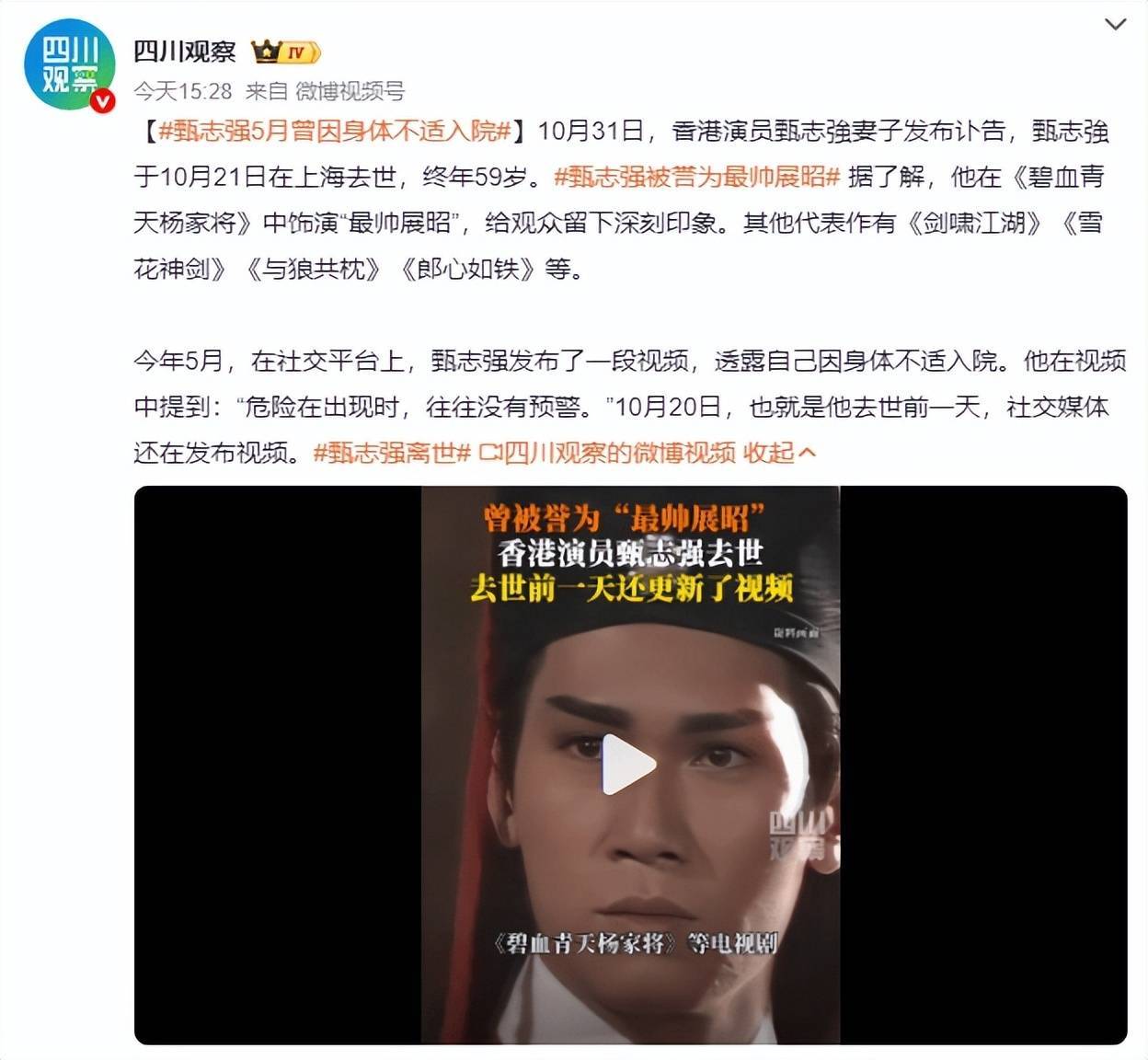 10月31日,香港演员甄志強妻子发布讣告,甄志強于10月21日在上海去世,终年59岁。据了解,他在《碧血青天杨家将》中饰演“最帅展昭”,给观众留下深刻印象。其他代表作有《剑啸江湖》《雪花神剑》《与狼共枕》《郎心如铁》等。